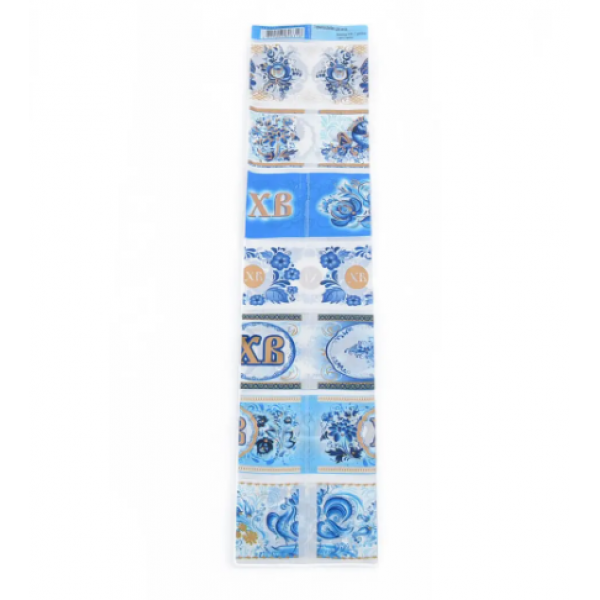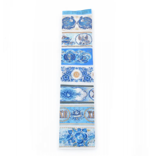 Название этих термонаклеек для пасхального декора яиц говорит само за себя – Гжельская роспись. Гжельская роспись абсолютно узнаваема, так как она выполняется только в сине-голубой цветовой гамме. Также гжельская роспись характерна тем, что на белом фоне изображен сказочно-фантазийный мир цветов и птиц. На некоторых наклейках присутствует аббревиатура традиционного пасхального приветствия ХВ (Христос Воскресе).