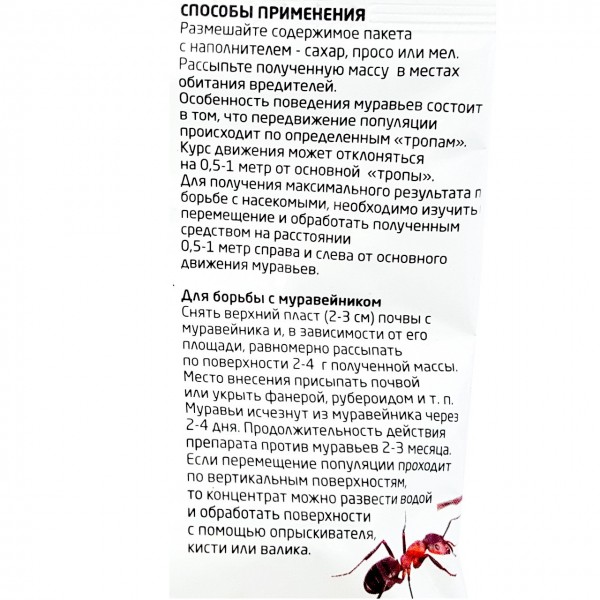 Концентрат Муравей Нет Муравьи - насекомые, безусловно, полезные. Однако, когда они поселяются на даче, приусадебном участке, в квартире или в складских и производственных помещениях, то создают массу неудобств. Более того, они портят продовольственные запасы и товары. Концентрат Муравей Нет - очень эффективный препарат двойного действия для уничтожения муравьев и других бытовых вредителей. Основной ингредиент данного препарата - имидаклоприд 20%. Это вещество, проникая в организм насекомых, вызывает конвульсии, паралич и гибель вредителей. Муравей НЕТ концентрат двойного действия. Он одновременно привлекает к себе муравьев и уничтожает насекомых. Работать с концентратом просто: смешайте содержимое пакета Концентрат Муравей Нет с любым продуктом или веществом, привлекающем муравьев ( сахар, просо, мел и т.д.) или с водой (для обработки вертикальных поверхностей). Далее обработайте разведенным препаратом Муравей Нет места сосредоточения и сами муравьиные тропы. Если вы обнаружили на территории муравейники, то советуем аккуратно снять 2-3 см почвы с муравейника и по всей площади рассыпать от 2-х до 4-х грамм смеси. Места, обработанные инсектицидным препаратом на основе имидаклоприда, следует присыпать почвой или укрывать любым другим материалом (фанерой, рубероидом и т. п.). Муравьи исчезнут через 2-4 дня. Если муравьиные тропы проходят по вертикальным поверхностям, то концентрат Муравей Нет следует развести водой и обработать поверхности с помощью опрыскивателя или кисти. Средство защиты от муравьев действует на протяжении 2-3 месяцев. Применение: от муравьев Преимущества: эффективен для борьбы с муравьями В нашем интернет-магазине 7Garden, Вы найдете широкий выбор шлангов, опрыскивателей, поливочных пистолетов, систем капельного орошения, брандспойтов, сеток, оросителей, соединительной и другой фурнитуры, бытовых товаров и одежды.