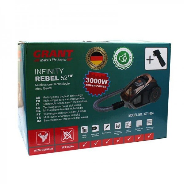 Пылесос контейнерный без мешка Grandberg Royals GT-1604, коричневый Чистота и порядок в доме, офисе, на даче или в любом другом помещении – задача не из легких, которая требует от нас постоянного внимания и решения. Пыль, мелкий мусор, шерсть домашних животных, крошки – это все оказывается на полу. И тогда на помощь приходит пылесос. Контейнерный пылесос Grandberg Royals GT-1604 - бытовой пылесос циклонного типа без мешка для сбора пыли, предназначен для уборки различных помещений. Его корпус изготовлен из высокопрочного и экологически безопасного пластика. Пылесос контейнерный Grandberg Royals GT-1604 работает на основе технологии мультициклон, то есть создается небольшой вихрь, который удерживает мусор внутри контейнера. Мотор генерирует поток, под воздействием которого частицы пыли и грязи крутятся в области фильтрационной системы и оседают на стенках промежуточного контейнера. Пылесос контейнерный без мешка имеет автоматическую намотку шнура, индикатор наполнения пылесборника, а благодаря нера-фильтру, 4-х ступенчатую систему фильтрации. У этой модели пылесоса шланг вращается на 360 градусов и имеет воздушный поток на ручке. Такой пылесос удобно хранить и транспортировать, ведь он достаточно компактный и оснащен удобной ручкой для переноса. Характеристики: производитель: Grant мощность всасывания 800 Вт; мощность 3000 Вт; питание от сети 220V - 50 Гц тип уборки: сухая тип пылесборника: циклонный фильтр, контейнер объем пылесборника: 2.5 л автоматическая намотка шнура длина шнура 3 метра вращение шланга на 360 градусов, с воздушным потоком на ручке индикатор наполнения пылесборника удобная ручка для переноски нера-фильтр 4-х ступенчатая система фильтрации вес: 5 кг. Комплектация: пылесос Grant GT-1604 3000 Вт 2 щетки: пластиковая щетка для пола и щелевая насадка трубка из высококачественной нержавеющей стали шланг заводская упаковка Применение: для уборки помещений для сбора пыли и мелкого мусора Преимущества: технология мультициклон небольшие габариты простота в использовании У нас вы найдете широкий выбор шлангов, опрыскивателей, поливочных пистолетов, систем капельного орошения, брандспойтов, сеток, оросителей, соединительной и другой фурнитуры. Вы найдете у нас товары на любой вкус для дома и офиса, дачи, сада и огорода, отдыха и путешествий. Также мы порадуем вас большим выбором подарков и сувениров, товаров для праздника и хорошего настроения.